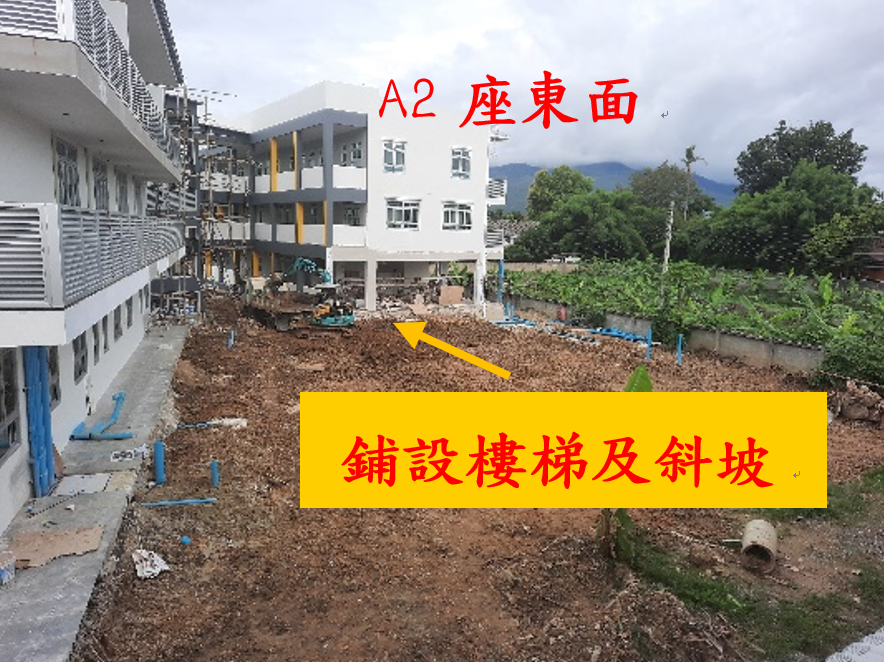 A1與A2座的地底均需要安裝一個排水系統,我們把泥土挖掘出來後,暫把它放置在禮堂旁側,待系統裝置完成後,就可以用來重鋪地面,包括鋪砌讓輪椅使用的斜坡,仍餘下合用的泥土,會留作校園種植之用。