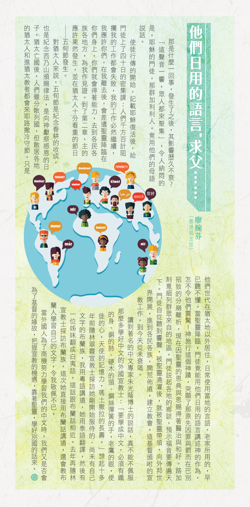 讀到著名的中文專家朱光蔭博士的說話,真不能不佩服那麼多學好中文的外國宣教士:「要學成中文,必須有鐵的身、銅的肺、硬木的頭、鋼絲彈簧的手,老鷹的眼,使徒的心,天使的記憶力,瑪土撒拉的長壽。」想起十多年前隨林翠霞宣教士探訪她剛開始服侍的、尚未有自己文字的布蘭族,我用粵語講道,她用泰語翻譯,然後有一位姊妹翻成白夷話,這話跟布蘭話相近。去年再隨林宣教士探訪布蘭族,這次她直接用布蘭話講道,還會教布蘭人學習自己的文字,令我敬佩不已。
